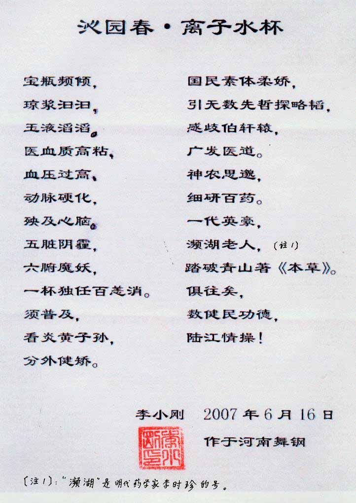 -----我是從事建筑的高工,本來沒有資格去攻克醫(yī)學難題,卻為了自身健康才扣響醫(yī)學的大門。由于我1990年患高血壓,因怕中風才研究發(fā)明了離子水瓶,我把水處理成微小分子團水,飲用后治愈了高血壓。便于1993年底送到三家省級醫(yī)院做臨床試用4個月。經(jīng)北京和廣西醫(yī)學專家鑒定:"降脂降壓效果好"," 能擴大心腦動脈流量,改善心腦電圖以及微循環(huán)","對治療心腦動脈粥樣硬化、高血壓、高血脂有良好的醫(yī)療保健作用。""產(chǎn)品的技術性能和療效達到了同類產(chǎn)品的國內(nèi)領先水平,經(jīng)廣西醫(yī)學科學情報研究所檢索,未見國外有類似報道。"中國醫(yī)學科學院張正國教授從美國國立醫(yī)學圖書館數(shù)據(jù)庫存Medline檢索英俄文資料,均未見類似報告。2000年上市后,我為了對消費者負責而繼續(xù)觀察研究,一直通過《信譽卡》和《質量跟蹤調查書》向患者承諾療效,請用戶使用6個月后反饋效果。和脂壓患者飲用2至5個月內(nèi),消除癥狀,停服藥物,血壓正常;冠心病患者飲用3~5個月逐漸減輕至消除心絞痛、房顫等癥狀,不再服藥,飲用1年左右心電圖正常,經(jīng)冠脈造影掃描無明顯狹窄,表明冠心病痊愈。大量患者還反映許多衰弱器官被修復,讓前列腺增生、慢性咽喉炎、慢性氣管炎、支氣管炎、慢性胃炎、腸炎和膽囊炎等不藥而愈;2型糖尿病患者是因為胰島衰弱致病,飲用該水半年至一年,逐漸減藥至停藥,血糖尿糖正常,真正治愈2型糖尿病。中風后遺癥患者飲用六七個月,可逐漸減輕至消除肢體和語言障礙,表明飲用該水能讓壽命很長的神經(jīng)元細胞逐漸修復,奇跡般地恢復肢體和語言功能。飲用后還使胸腺和脾臟兩個重要的免疫器官被修復和增強,產(chǎn)生免疫細胞多,提高了免疫力,使人不生病或少生病。自此, 飲用微小分子團水創(chuàng)造了攻克冠心病、高(低)血壓和糖尿病三大醫(yī)學難題的奇跡。人們對此感到不可思議,但實踐是檢驗真理的唯一標準。